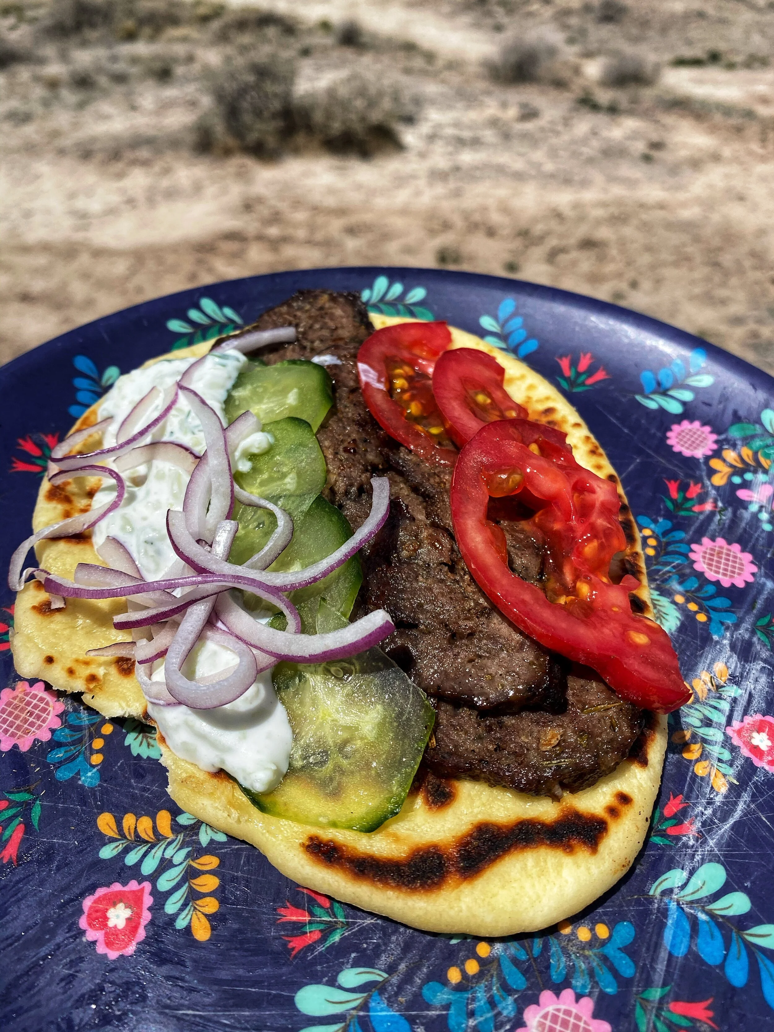 Assemble! Thinly sliced cucumber, onion, and tomato are the way to go. Crumbled feta would also be good. We had some but were so excited we forgot to add it. Don’t forget to load up on tzatziki sauce!